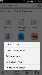 2. Tap the phones ‘Menu’ button. Select ‘Bookmarks’. Then in the bookmarks list you need to add the bookmark to the Home Screen. To do this tap & hold the icon. A menu will appear then select to ‘Add to home screen’.